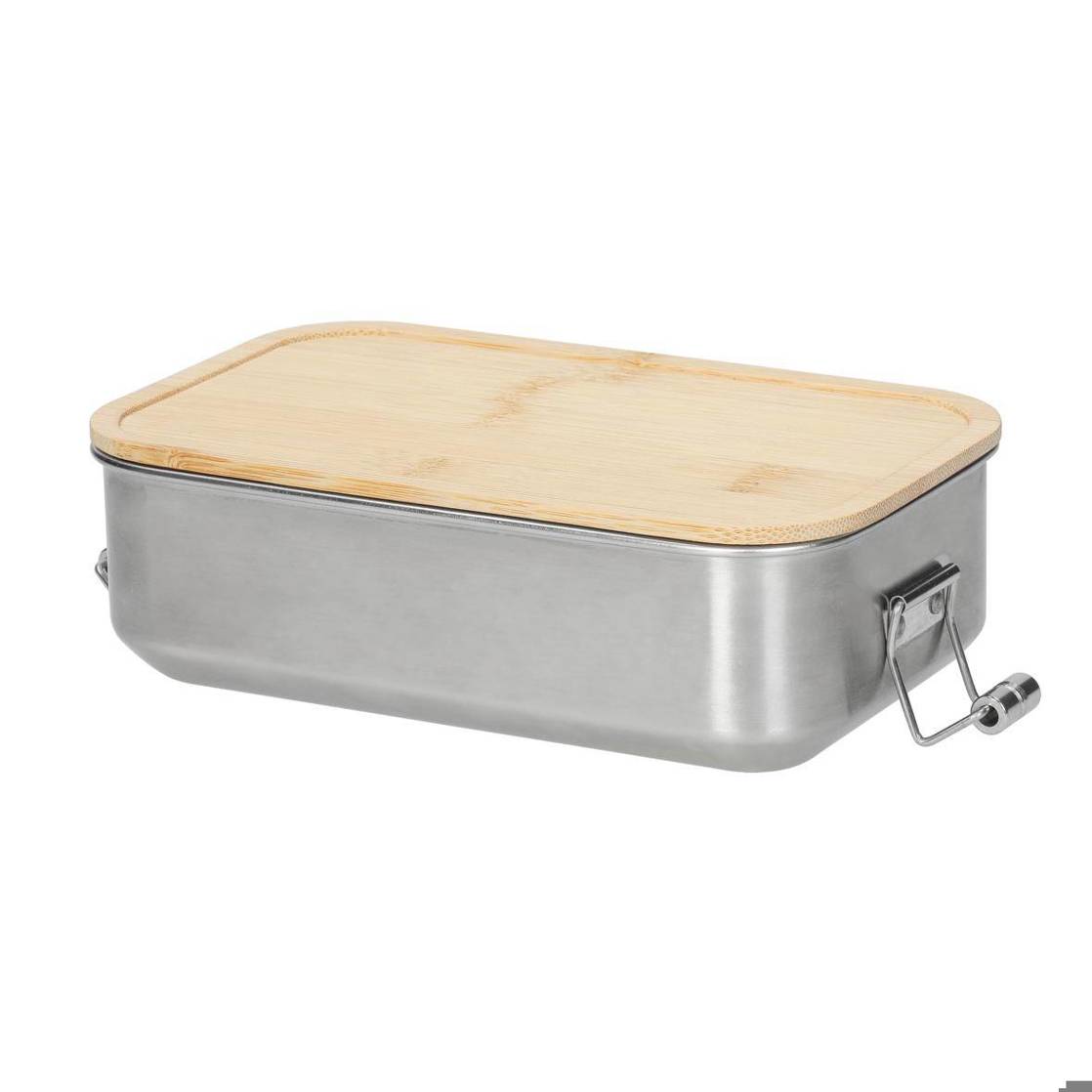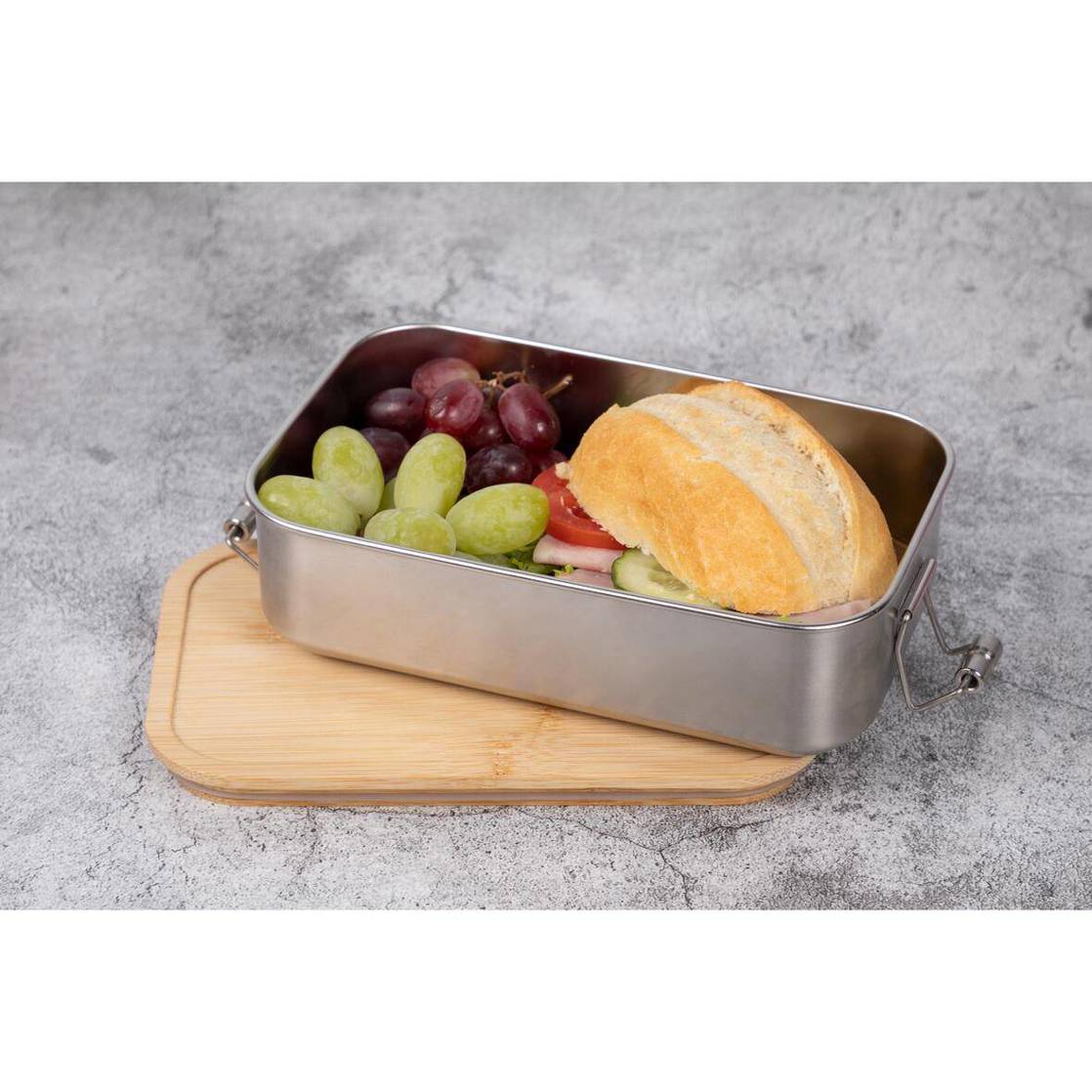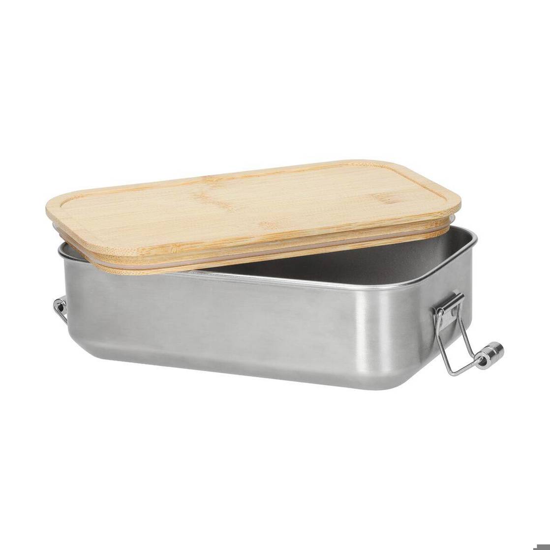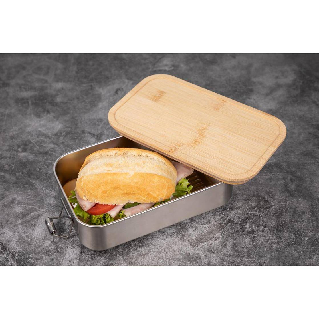 Diese stilvolle Dose ist aus hochwertigem Edelstahl gefertigt, der für seine Langlebigkeit und Pflegeleichtigkeit bekannt ist. Der abnehmbare Deckel aus natürlichem Bambus sorgt nicht nur für ein ansprechendes Design, sondern kann auch multifunktional als Brotzeitunterlage verwendet werden.