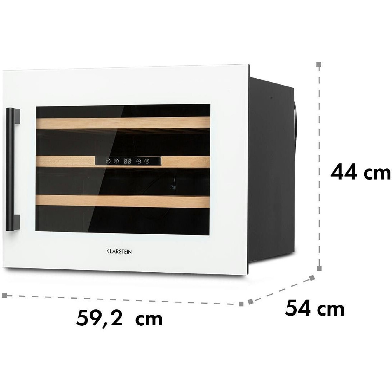 Entdecken Sie den Klarstein Vinsider 24 Built-In Uno in elegantem Weiß, die perfekte Lösung für Weinliebhaber, die ihren edlen Tropfen die richtige Pflege bieten möchten. Mit einer kompakten Bauart von 56,8 cm tief, 59,3 cm breit und 46 cm hoch passt dieser freistehende Weinklimaschrank mühelos in jede Ecke Ihrer Küche oder Ihres Wohnzimmers.